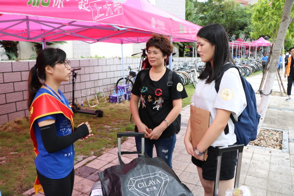 天气时而小雨淅淅沥沥,时而大雨倾盆而至,但这丝毫影响不了志愿者热情,新“嘉”人的到来,是志愿者们最大的动力,他们始终面带笑容,为新生做指引,帮新生搬运行李,并帮助新生完成报到手续等。信息科学与技术学院的志愿者们,在雨天中为新生和新生家长带来了一条蓝色的风景线。