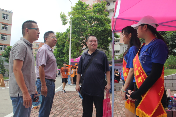 2018年8月28日上午,信息科学与技术学院院长夏靖波和党总支书记林斌一起来到迎新工作点,看望迎新志愿者,并走访新生园区,跟新生和家长们进行交谈,了解新生的报到情况,询问其宿舍是否还存在需要报修的情况,并叮嘱其一些新生注意事项等。