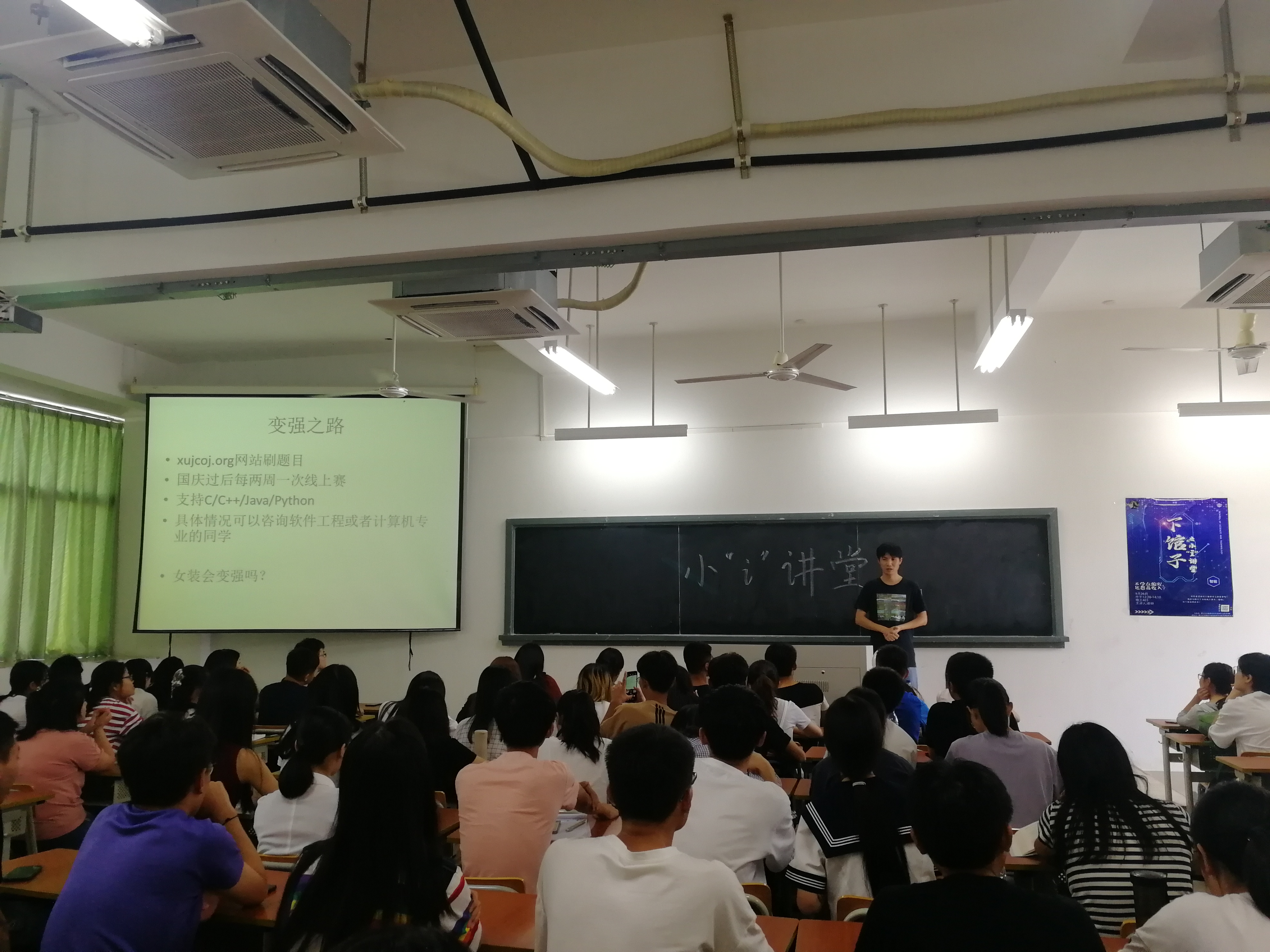 2018年9月26号下午12点半,由信息科学与技术学院学生会主办、科技部协办的小i讲堂在理工楼#403召开,邀请了信息科学与技术学院资深教师蔡明老师对编程的有关内容进行讲解,130左右的同学聆听了此次讲座。