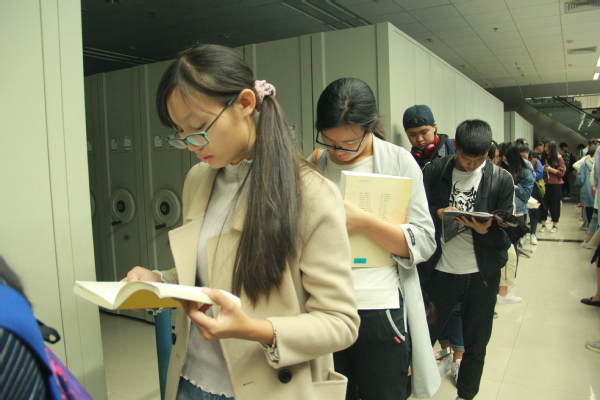 从图书馆一楼签到处依次向外,同学们自觉有序的等候签到。由于10月17日至10月28日签到可享三倍μ值,同学们参与"下馆子"活动的积极性空前高涨,签到队伍一直延伸至大厅,在学促部工作人员的引导下呈“蛇形”排列,并在最外侧留出“出口通道”方便签完到的同学及时离开,提高了签到效率,井然有序,保证了参于活动的同学都能在规定时间内成功签到。