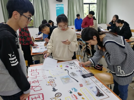 此次比赛的参赛人员共分为八组,在了解本次比赛的注意事项和评分标准后,各组开始时长为一小时的剪贴画制作,剪贴画制作完成后,各组对自己的作品进行宣讲,介绍剪贴画的内容和创作理念。