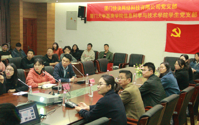 会议开始后,厦门快快网络科技有限公司招聘人事主管陈韵田介绍了公司的基本情况,厦门快快网络科技有限公司成立于2013年,主要研究领域为智慧城市和数据安全。随后,厦门快快网络科技有限公司党支部书记张功洪介绍了支部基本情况,他表示,支部十分重视既具有扎实专业技能,又具有高度政治素养的职工党员培养。紧接着,信息科学与技术学院学生党务助理庄梦洁介绍了学生党支部的建设情况,丰富的党建活动展现了信息科学与技术学院学生党员的风采。