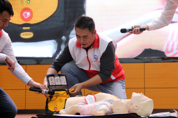 吴飙讲师强调,做心肺复苏前要通过轻拍肩膀等方式确认伤者是否还有意识、心跳和呼吸,心肺复苏要在无呼吸、无心跳的前提下进行。确认伤者需要进行心脏复苏以后可呼叫身边的人帮忙寻找附近的AED,如果在心肺复苏过程中找到AED,可先使用AED,按照AED的语音提示和屏幕显示进行应急急救,过程中要注意第一次电击后如果患者未恢复意识和呼吸,立刻继续做心肺复苏进行急救。吴飙讲师借助成人和儿童人体模型向大家细致地讲解了如何正确规范地进行胸外按压、开放气道、人工呼吸等,循环、反复直至救护车到来。关于大家近期关注的另一应急救护热点——气道异物梗阻,吴飙老师通过视频举例讲解了如何识别海姆立克征象,通过他人的配合和借助婴儿人体模型讲解了如何用海姆立克急救法进行自救与施救。